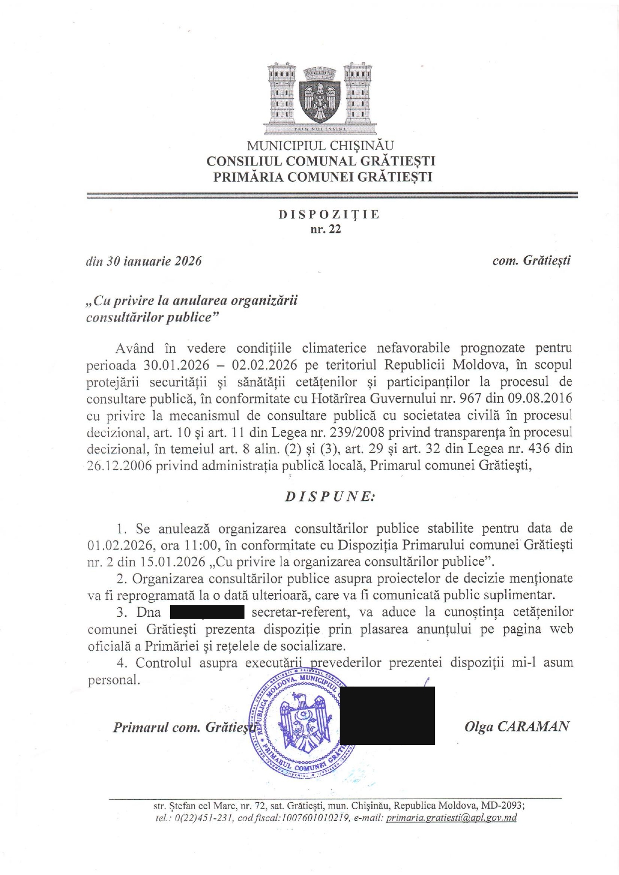 Consultările publice programate pentru data de 01.02.2026, se anulează din cauza condițiilor meteo nefavorabile.