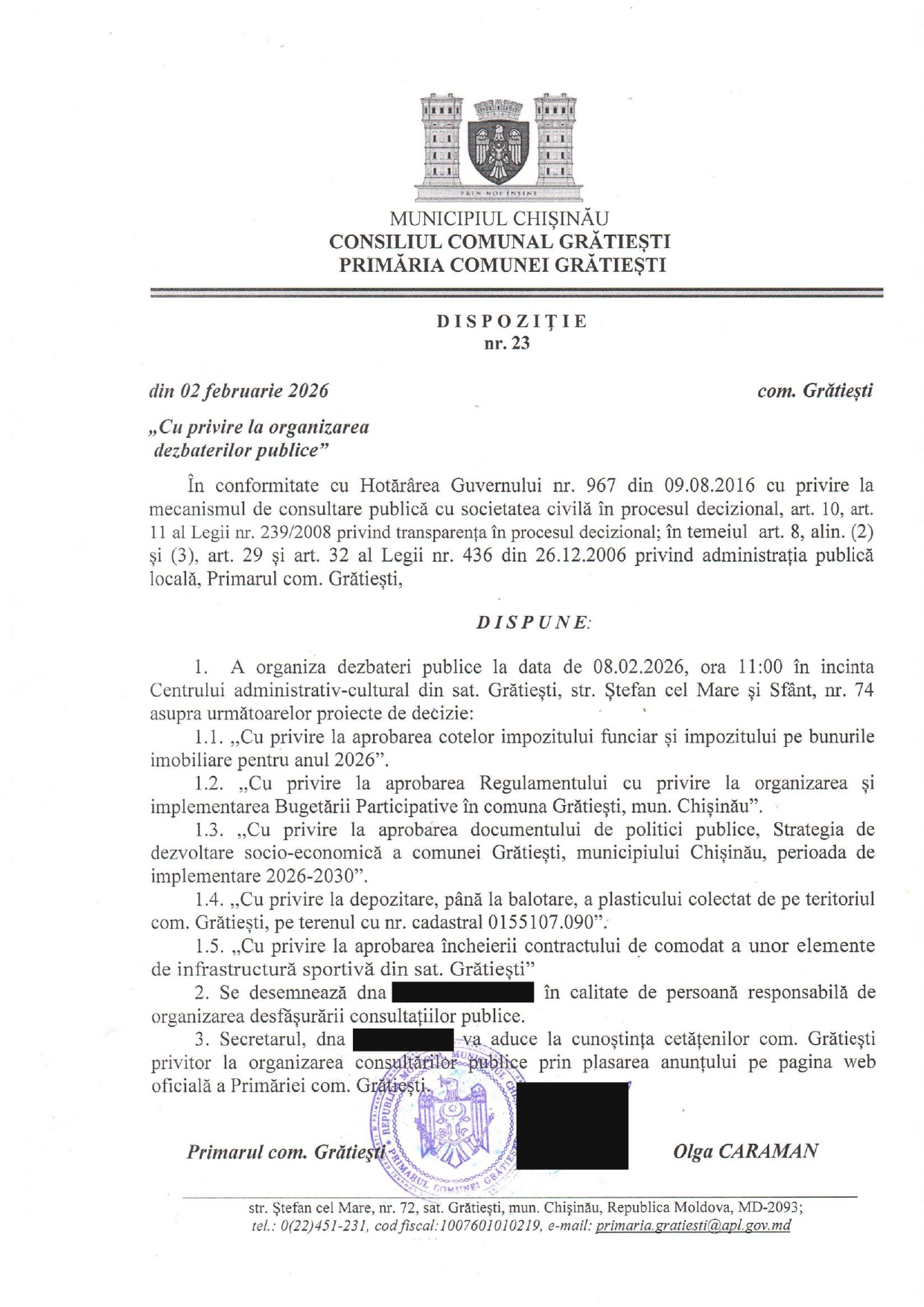 • ,,Cu privire la aprobarea documentului de politici publice, Strategia de dezvoltare socio-economică a comunei Grătiești, municipiului Chișinău, perioada de implementare 2026-2030”.