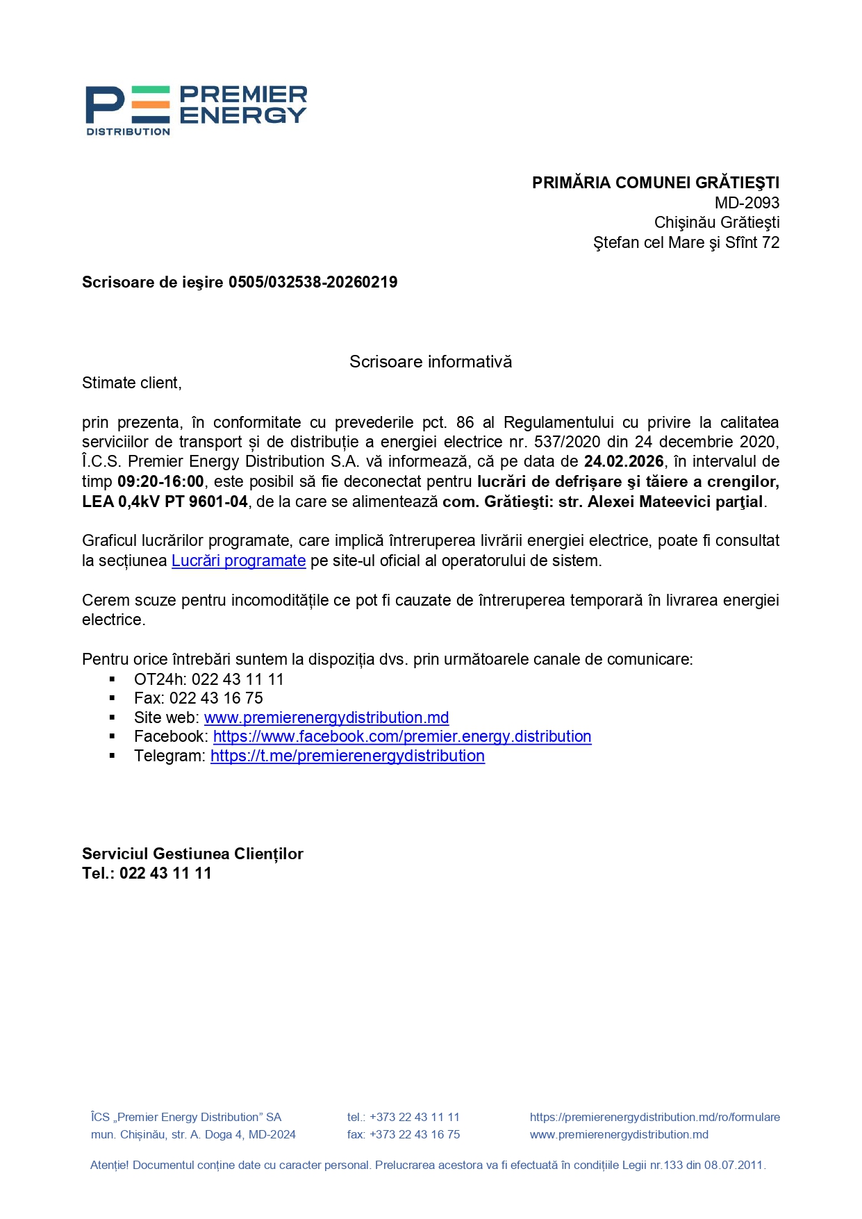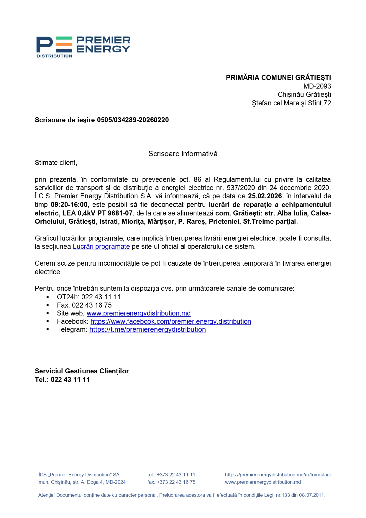 • 📢 Primăria comunei Grătiești aduce la cunoștința cetățenilor că, în perioada 24–25 februarie 2026, în intervalul orar 09:20–16:00, este posibilă întreruperea temporară a furnizării energiei electrice.