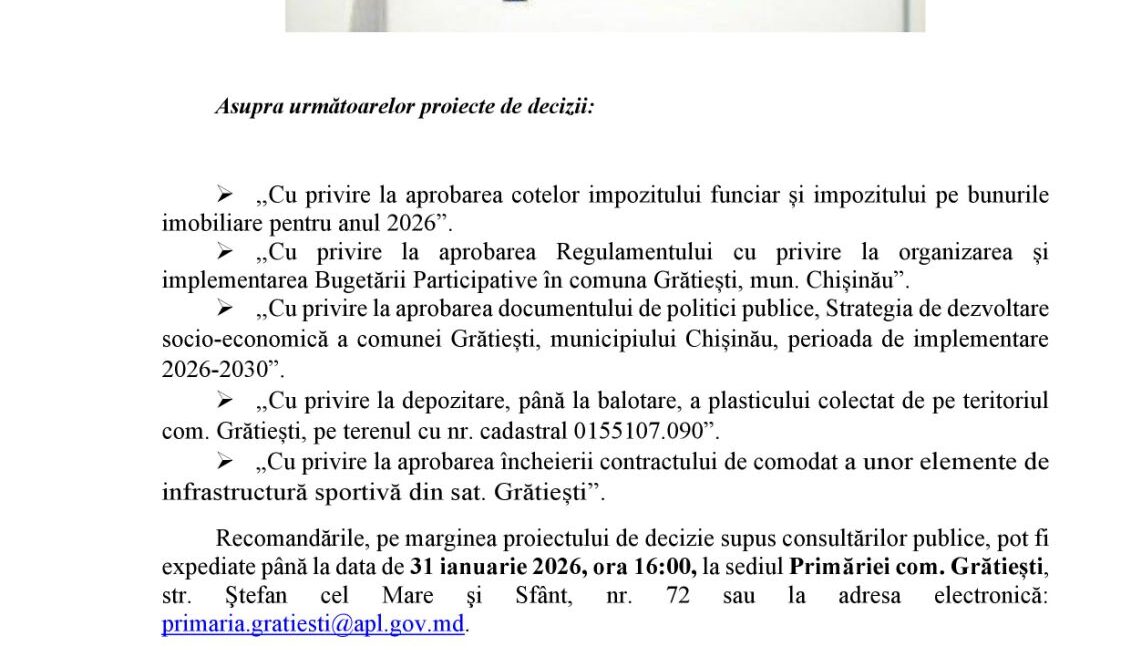 Dezbateri publice- 8 februarie 2026, ora 11:00.Asupra următoarelor proiecte de decizii:,,Cu privire la aprobarea cotelor impozitului funciar și impozitului pe bunurile imobiliare pentru anul 2026”.,,Cu privire la aprobarea Regulamentului cu privire la organizarea și implementarea Bugetării Participative în comuna Grătiești, mun. Chișinău”.,,Cu privire la aprobarea documentului de politici publice, Strategia...